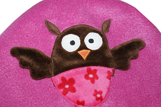 En vain pääse pöllöistä eroon; tällä kertaa tuloksena oli Helka Huhuu, joka taitaa olla lentoon lähdössä. Applikoinnit ovat velouria ja pipon materiaali on kaksinkertaista fleeceä. Näiden pitkänmallisten kuvioiden kuvaaminen pipossa on suhteellisen haastavaa ja kuvistakin tulee vähän kummallisen näköisiä, kun lapsen täytyy katsoa ikäänkuin alaspäin...